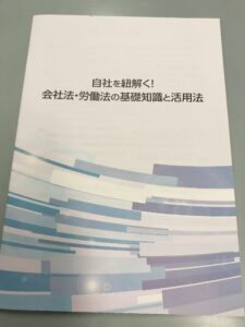 また、参加された会員の皆様に対しましては、限定で自作の書籍「自社を紐解く!会社法・労働法の基礎知識と活用法」もご提供いただきました。端的かつ簡潔な内容で、初心者でも法律の全体像がイメージしやすく、とてもわかりやすい内容でした。